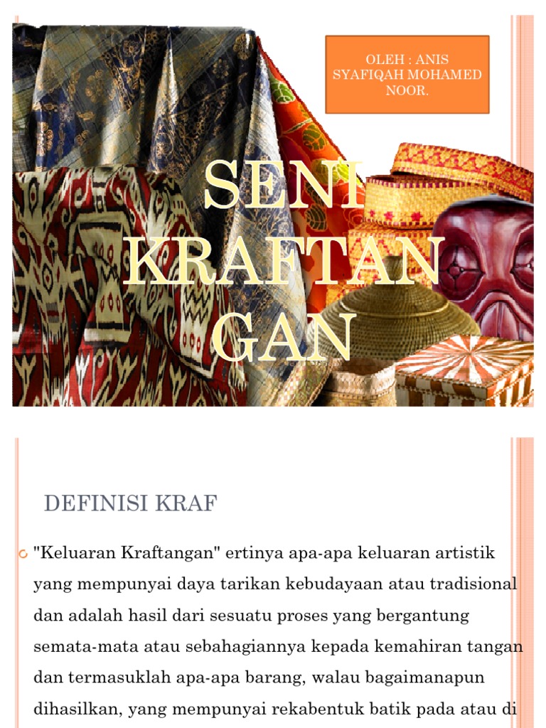 Dalam kata lain kraf tangan. PENGENALAN Menurut Kamus Dewan Edisi Keempat Kraf adalah satu perusahaan hiasan atau peralatan barangan yang memerlukan kemahiran terutamanya kemahiran menggunakan tangan. Keluaran Kraftangan ertinya apa-apa keluaran artistik yang mempunyai daya tarikan kebudayaan.